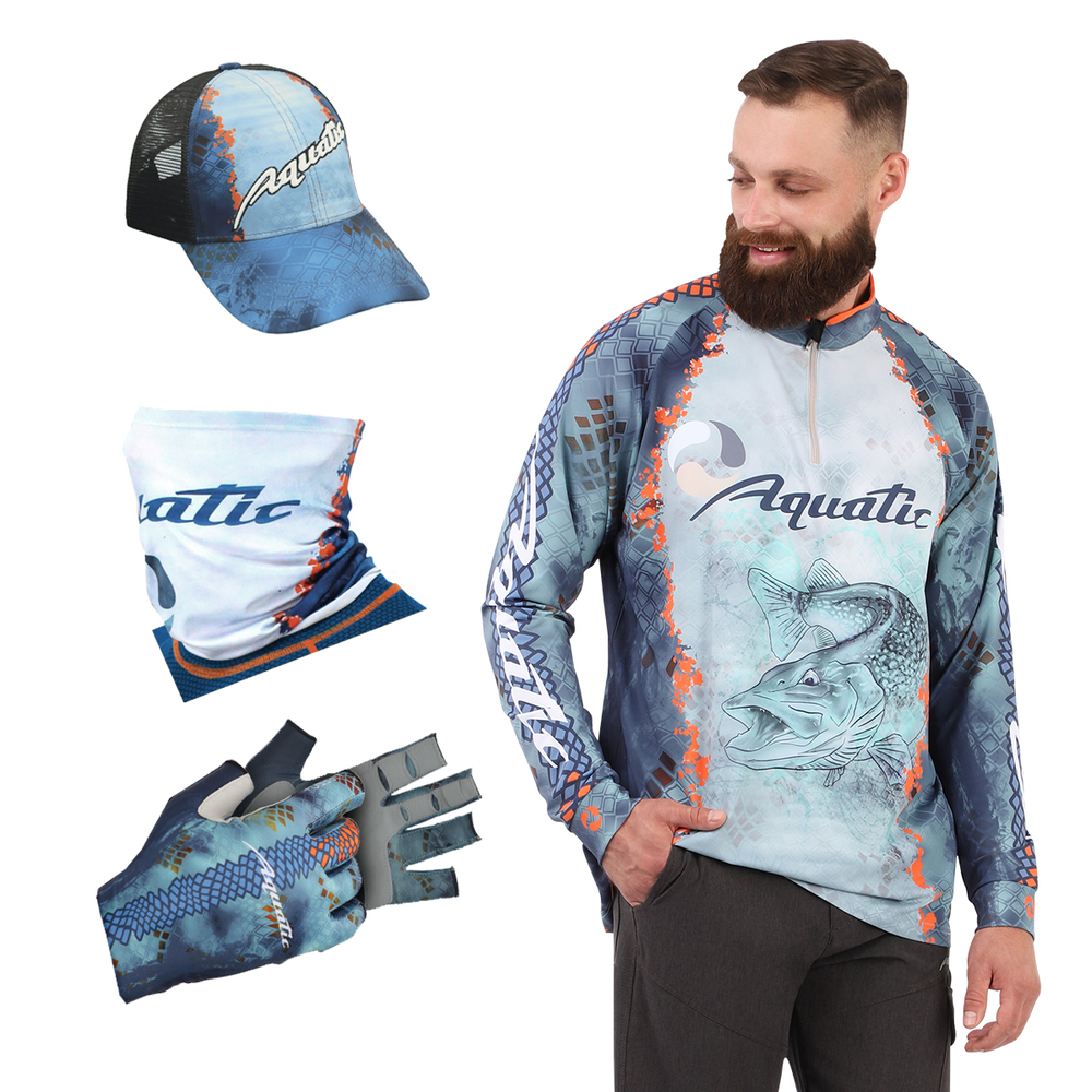 Также набор включает в себя универсальный бафф, который можно использовать как шарф-трубу, бандану, снуд, балаклаву или гейтор. Кепка с надписью "Aquatic" стильно дополнит образ рыбака и станет незаменимым аксессуаром для головы.