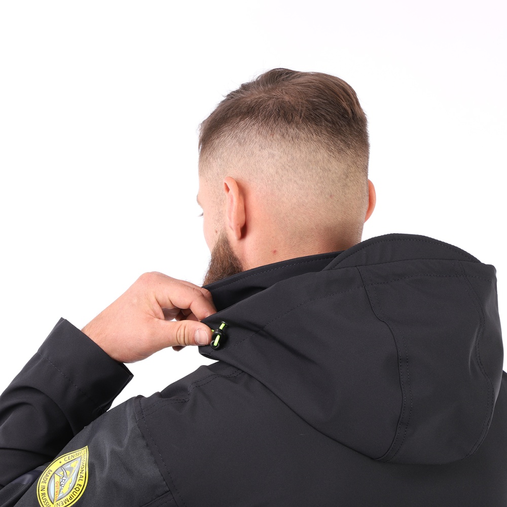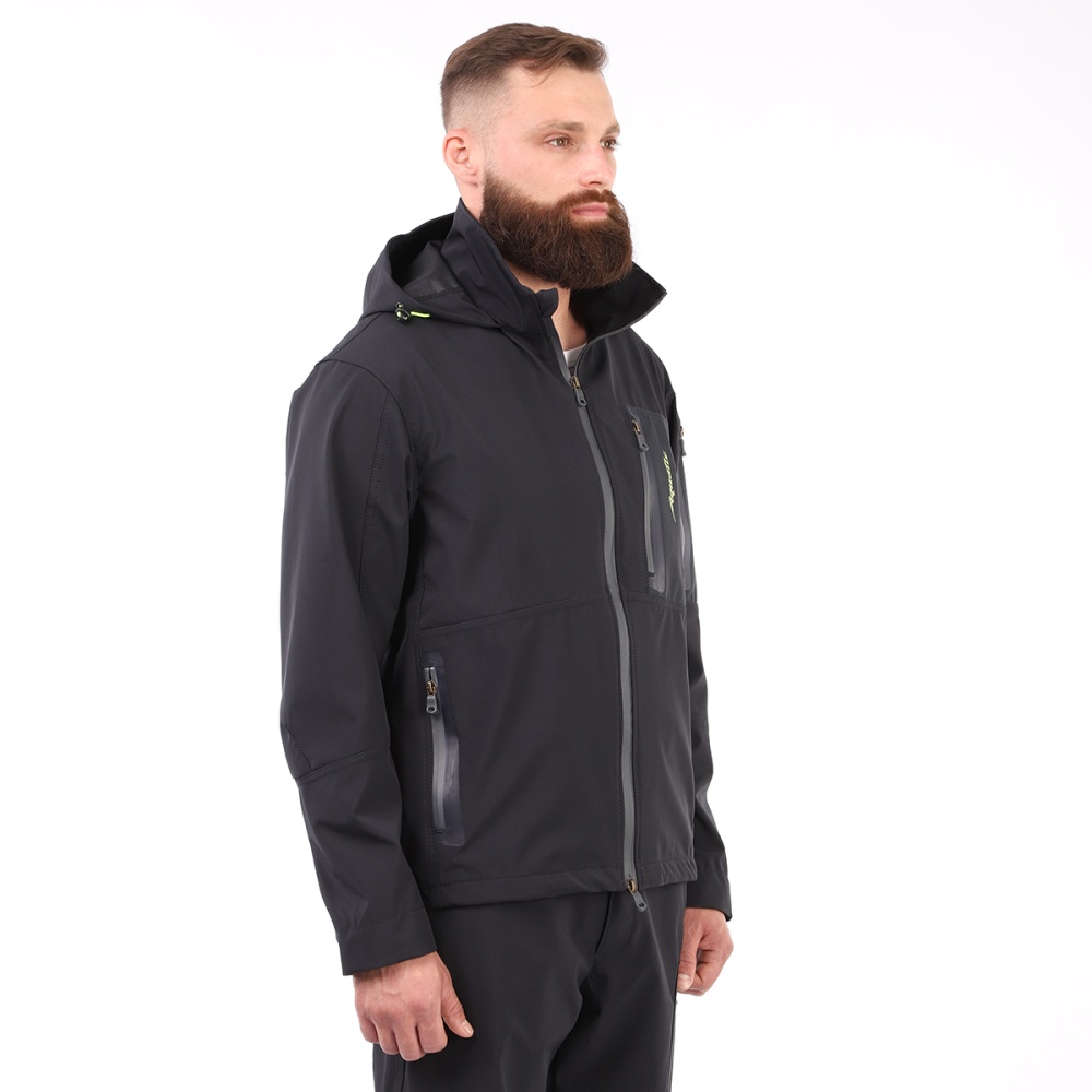 Куртка однотонная имеет декоративные вставки из водонепроницаемой ткани и надежную влагозащищенную молнию. Капюшон с козырьком и системой регулировки при необходимости убирается в воротник. Высокий воротник надежно защищает лицо и шею от ветра. Внутренняя трикотажная манжета на рукавах обеспечивает плотное прилегание к руке. В куртке два боковых кармана, один нагрудный и карман на рукаве для мелочей на молнии.