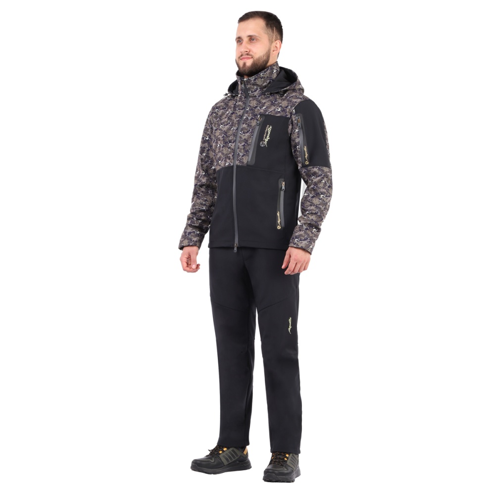 Костюм обеспечивает защиту от ветра и небольших осадков. Ткань костюма отводит влагу от тела и сохраняет тепло. Материал обладает эластичностью и не сковывает движения.
