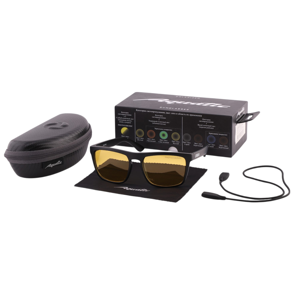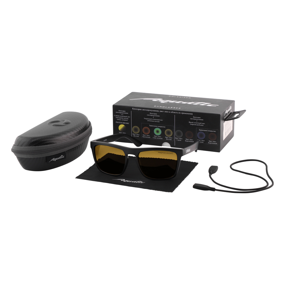 Желтые линзы очков AQUATIC модель «URBUN» относятся к первой-второй степени затемнения (Photochromic), очки пропускают от 18% до 80% света. Линзы с категорией затемнения 1-2 обычно используются в очках для коррекции зрения, а также в "имиджевых" очках. Для рыбалки применяются в ночное время для защиты глаз, от насекомых и ветра. Желтый цвет линз не утомляют глаза и подходят для езды на автомобиле в темное время и пасмурную погоду, дождь.