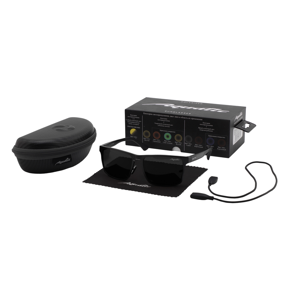 Солнцезащитные поляризационные очки Aquatic– это стильный аксессуар, который станет незаменимым помощником для любителей активного отдыха. Вы можете их носить длительное время благодаря алюминиевому материалу оправы, такие очки удивительно легкие и они устойчивы к коррозии. Вес очков составляет 27 г. Очки «SANTORI» подходят для лиц среднего и крупного размера. Поляризационные линзы выполнены из РС Polarized и улучшают детализацию предметов для оптимального восприятия. Серые линзы очков AQUATIC модель SANTORI относятся к третьей степени затемнения, пропускают от 8% до 18% света. Это самая распространённая степень затемнения линз в солнцезащитных очках у рыболовов. Такие очки так же можно использовать в городе, для отдыха на море и спортивных занятий в солнечную погоду. Серый цвет линз не искажают цветовую гамму, не утомляют глаза. Минус – в тёмных очках с серыми линзами не стоит водить машину при недостаточном освещении. Категория защиты глаз UV400- линзы способны блокировать ультрафиолетовые лучи длиной до 400 нм, предотвращая пагубное воздействие солнечного излучения на глаза. Очки Aquatic поглощают 100% ультрафиолетового излучения.