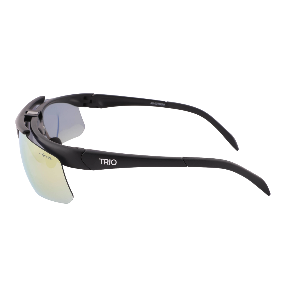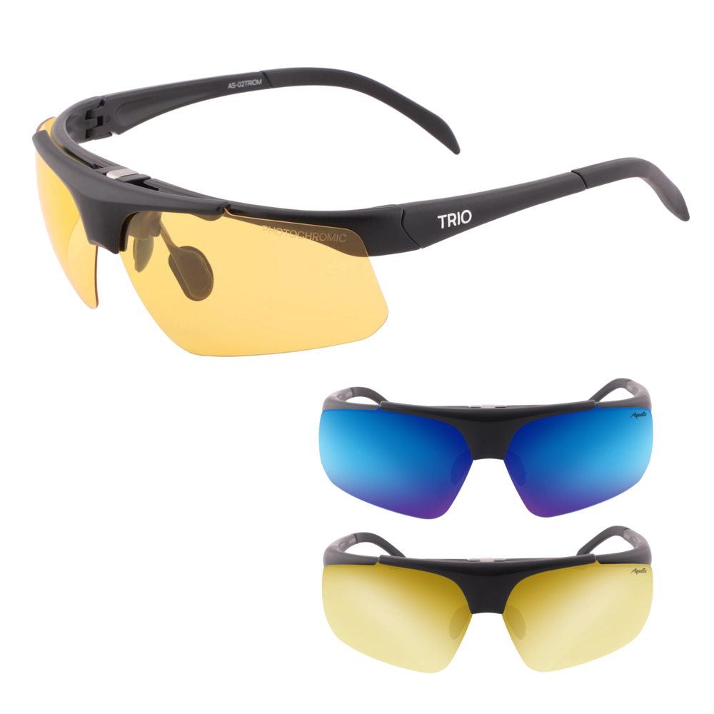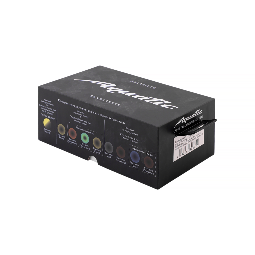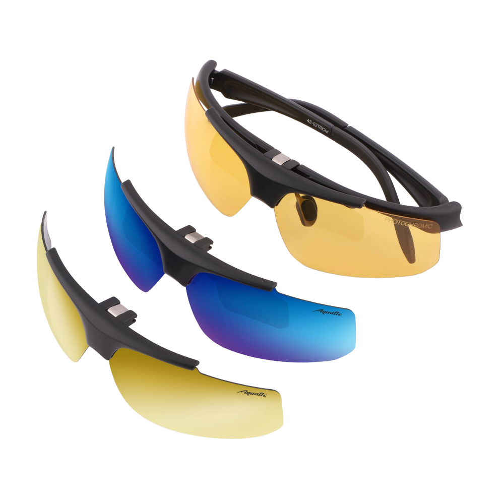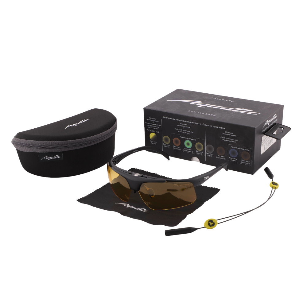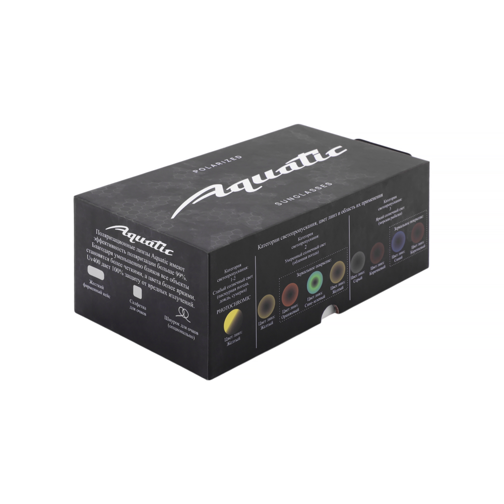 Это универсальные очки, подойдут в переменную облачность, солнечную и пасмурную погоду. Когда нет возможности иметь при себе несколько видов очков. В наборе три съемных линзы с желтым, зеркальным синим и зеркальным желтым цветом. Могут применяться в спорте, туризме, рыбалке. Категория защиты глаз UV400 - линзы способны блокировать ультрафиолетовые лучи длиной до 400 нм, предотвращая пагубное воздействие солнечного излучения на глаза. Очки AQUATIC поглощают 100% ультрафиолетового излучения.