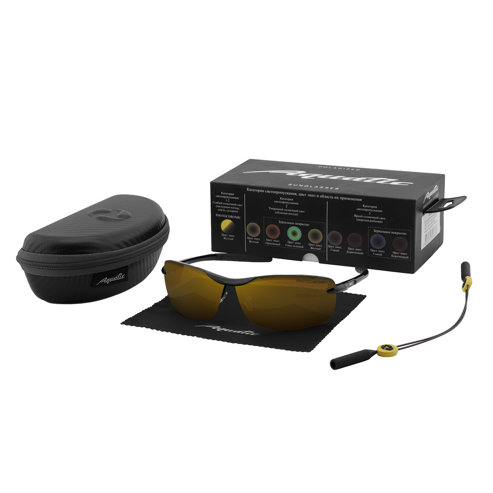 Желтые линзы очков AQUATIC модель «DRIVE» относятся к первой-второй степени затемнения (Photochromic), очки пропускают от 18% до 80% света. Линзы с категорией затемнения 1-2 обычно используются в очках для коррекции зрения, а также в "имиджевых" очках. Для рыбалки применяются в ночное время для защиты глаз, от насекомых и ветра. Желтый цвет линз не утомляют глаза и подходят для езды на автомобиле в темное время и пасмурную погоду, дождь.