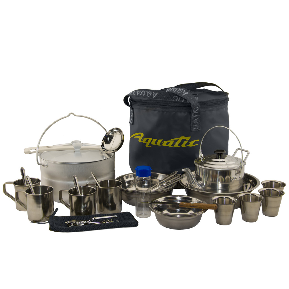 Состав набора: • Котелок 4, 5 л. (алюминий) - 1шт. • Чайник 1 л. (алюминий) - 1шт. • Миска 1,7 л (нержавеющая сталь) - 1 шт. • Миска 1 л (нержавеющая сталь) - 4 шт. • Тарелка плоская (нержавеющая сталь) - 4 шт. • Кружка 350 мл (нержавеющая сталь) - 4 шт • Стопка 100 мл (нержавеющая сталь)- 4 шт.