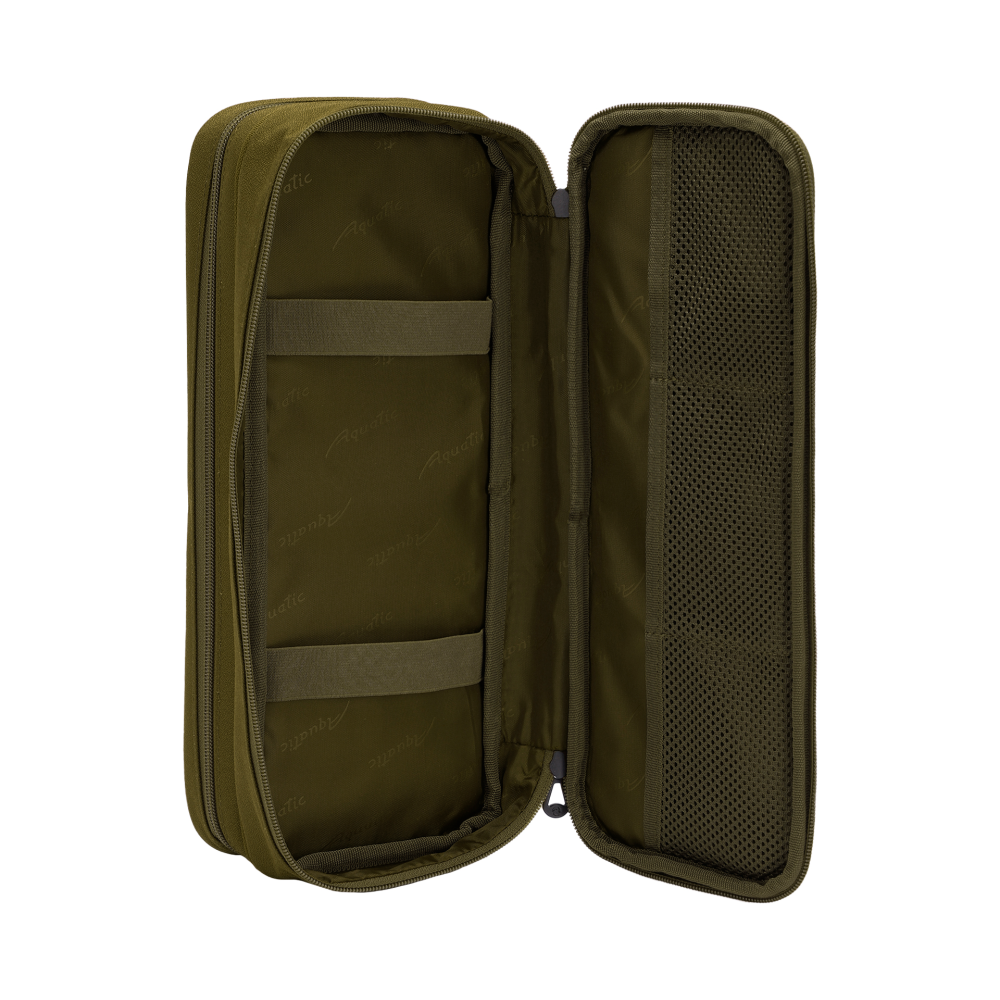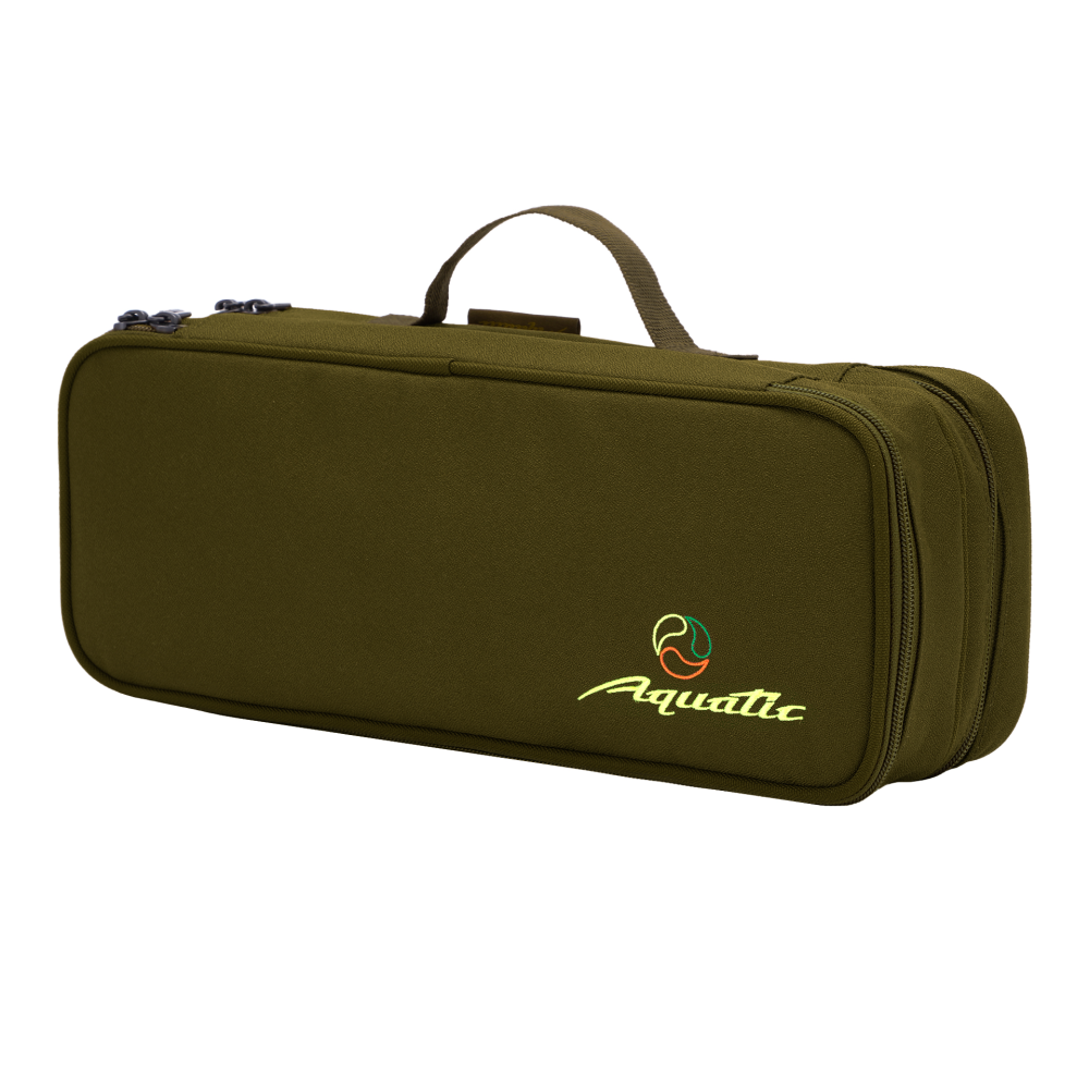 Рыболовная сумка Aquatic для поводков и аксессуаров C-1-04 изготовлен из прочной непромокаемой ткани 300D (340 гр/м.кв.) полиэстер с ПВХ покрытием. Габаритные размеры: 36х14х9 см. Поводочница имеет два отсека. Первый отсек имеет габариты 36х14х4 см, в нем размещены боковые 3 кармана из сетчатого материала и 2 резинки для фиксации рыболовных принадлежностей. Второй отсек имеет 2 поводочницы из материала ЭВА, которые крепятся на липучке, размер каждой 34х13х1.5 см и возможностью фиксации поводков булавками в количестве 20 шт., размерами 16-30 см. Сумка Акватик С-1-04 имеет удобную ручку для переноски.